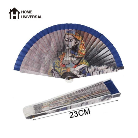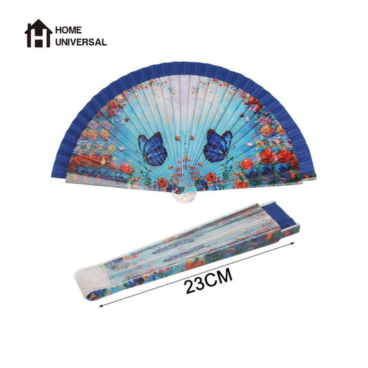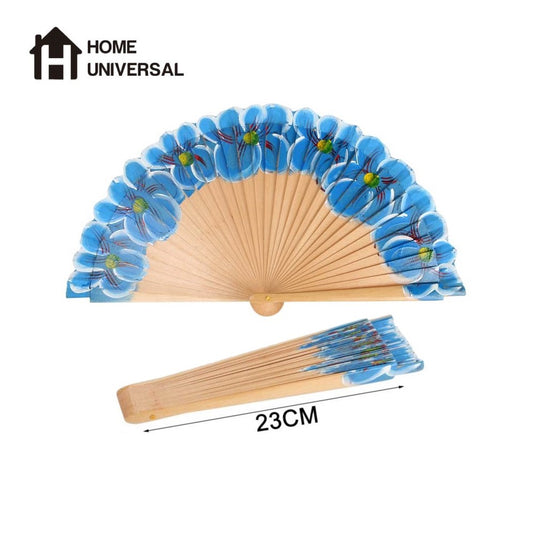 Home Universal ® Abanicos 23CM 1 pieza DE Madera Lisa con Tela DE Marfil, Abanico DE Madera Adornado, Abanico Original (Floral Azul)