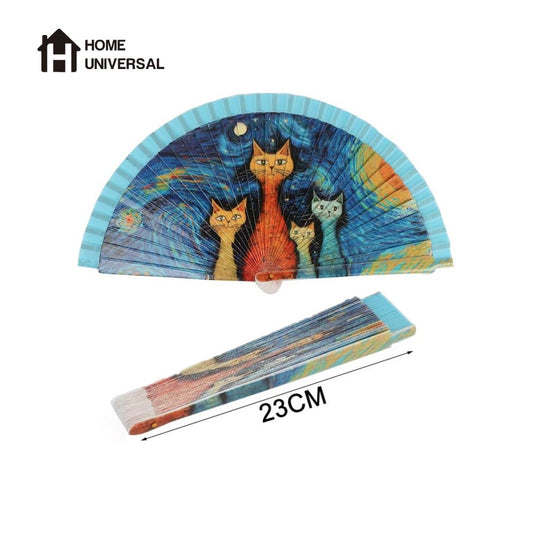 Home Universal ® Abanicos 23CM 1 pieza DE Madera Lisa con Tela DE Marfil, Abanico DE Madera Adornado, Abanico Original (Los Gatos de Van Gogh)