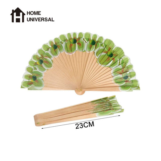 Home Universal ® Abanicos 23CM 1 pieza DE Madera Lisa con Tela DE Marfil, Abanico DE Madera Adornado, Abanico Original (Floral Verde)
