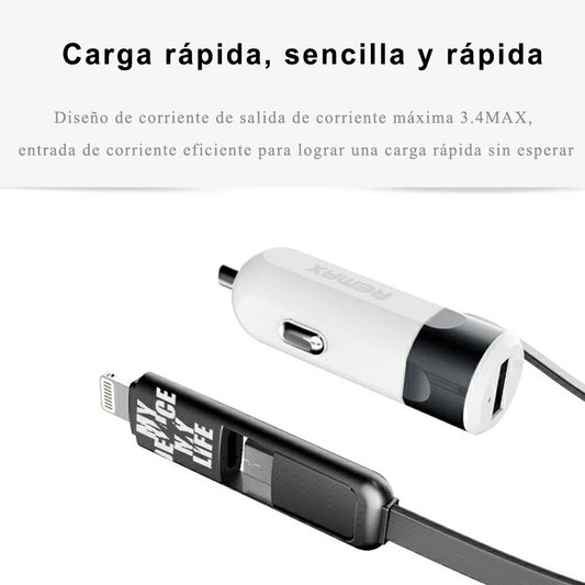 REMAX RCC 102 Cargador de Coche 3 en 1,DC12-24V, Cargador Mechero con Cable de Lightning y Adaptador de Tipo-C,5V-3.4A