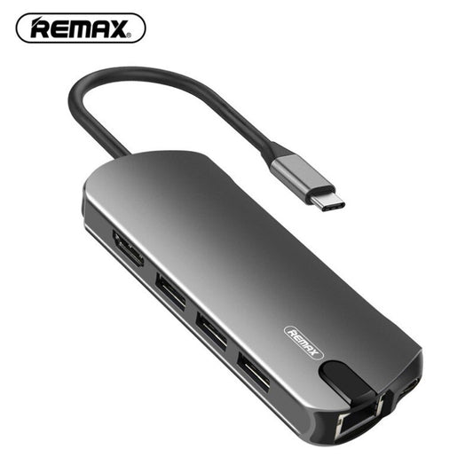 REMAX RU-U50 Docking Station con Puertos de HDMI, Tipo-C, Ethernet, Tarjeta SD, Tarjeta Micro SD y 3 USB , con Alta Velocidad para Conectar con Disco Duro Externo, Pen Drive, Ratón, Teclado, Móvil, Video 4K,Tarjeta SD, Internet