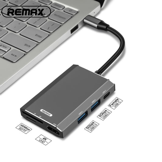 REMAX RU-U30 Docking Station Tipo-C con Puertos de HDMI, Tipo-C, tarjeta SD, Tarjeta Micro SD y 2 USB 3.0, con Alta Velocidad para Conectar con Disco Duro Externo, Pen Drive, Ratón, Teclado, Móvil, Video 4K,Tarjeta SD