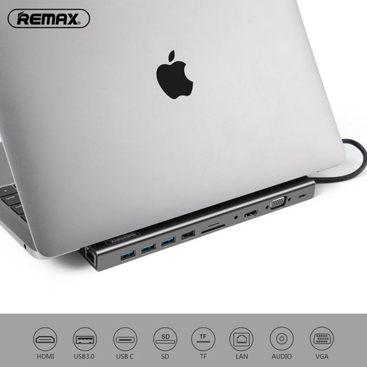 REMAX RU-U70 Docking Station Tipo-C con Puertos de HDMI, Tipo-C, VGA, Ethernet, tarjeta SD y TF,AUX,USB 2.0 y 3 USB 3.0, con Alta Velocidad para Conectar con Disco Duro Externo, Pen Drive, Video 4K,Internet,Monitor de PC, etc