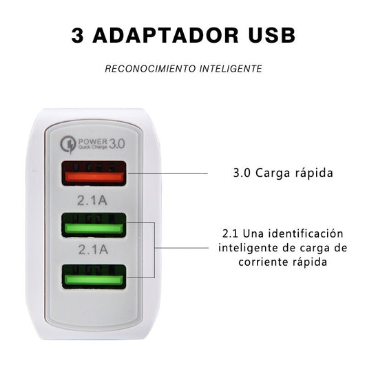 Cargador Móvil Rápido 3.0, 2.1A 5V Universal 3 USB Puertos Corriente Enchufe Móvil para iPhone Samsung Android