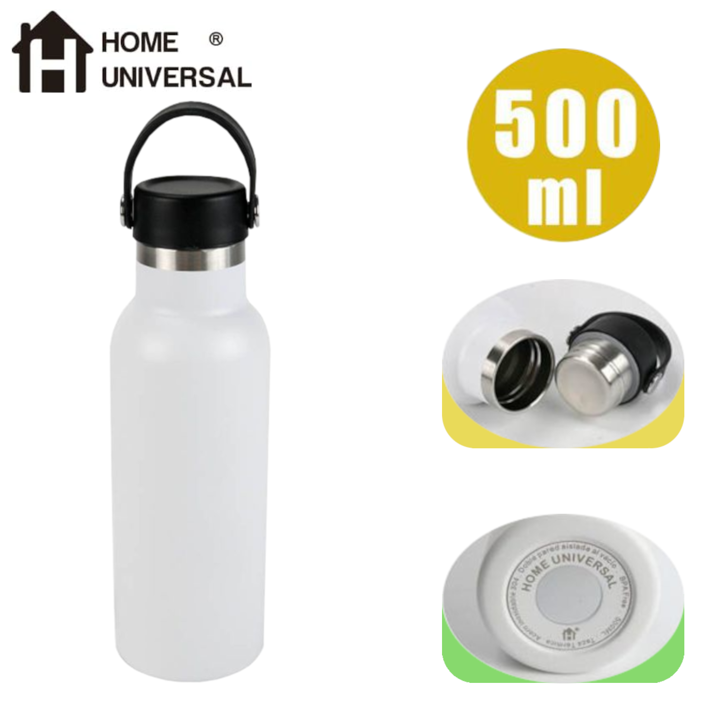 Home Universal® Botella Térmica 500ml de Acero Inoxidable | 12h y Frías 24h | Doble Pared | Mantiene Frío y Caliente por Horas | Antiderrames, Ligera e Ideal para Deporte, Oficina y Viajes (Blanco)