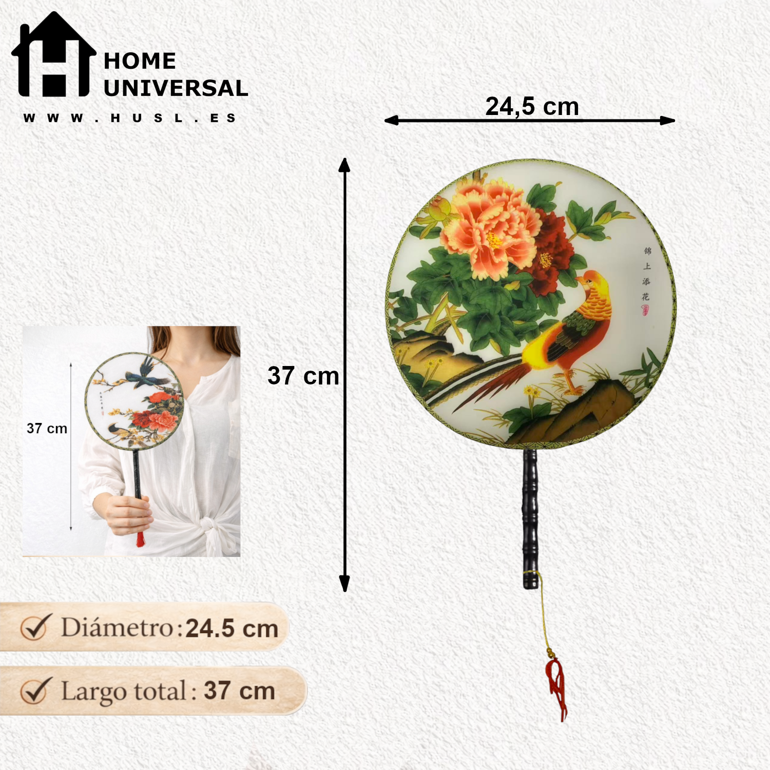 Este abanico redondo imprimido de una sola cara combina la elegancia de los abanicos redondos antiguos translúcidos y sedosos con el encanto de los abanicos clásicos de seda de mano, convirtiéndose en una pieza decorativa única y funcional. Su delicado patrón floral con aves aporta un estilo oriental tradicional que realza cualquier espacio, mientras que su acabado ligero y sedoso transmite calidad y sofisticación. Fabricado con tela de seda suave y resistente, y mango de madera firme y cómodo, es ideal tanto como decoración de pared para el hogar, salón o dormitorio, como accesorio elegante para eventos, sesiones fotográficas o regalo especial.