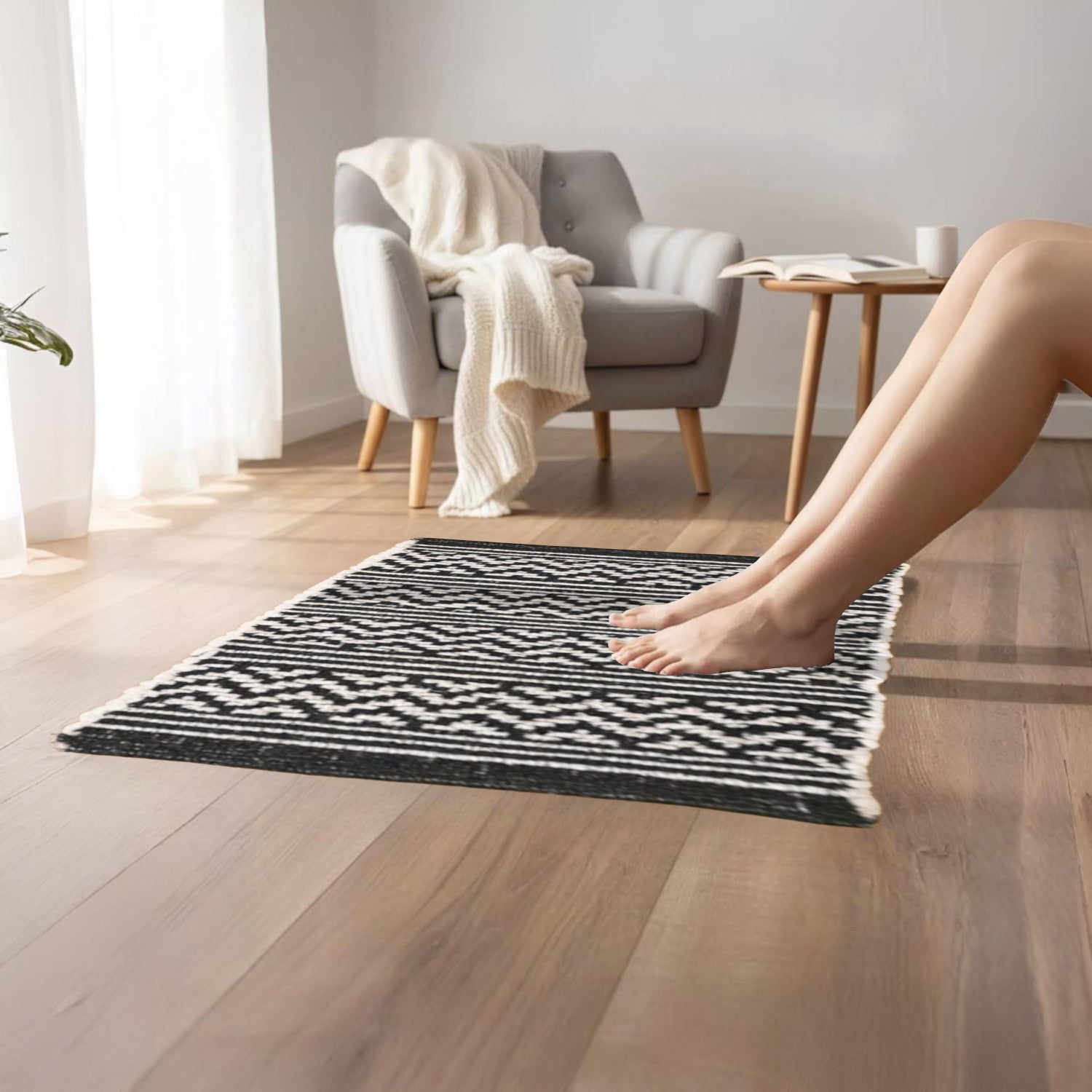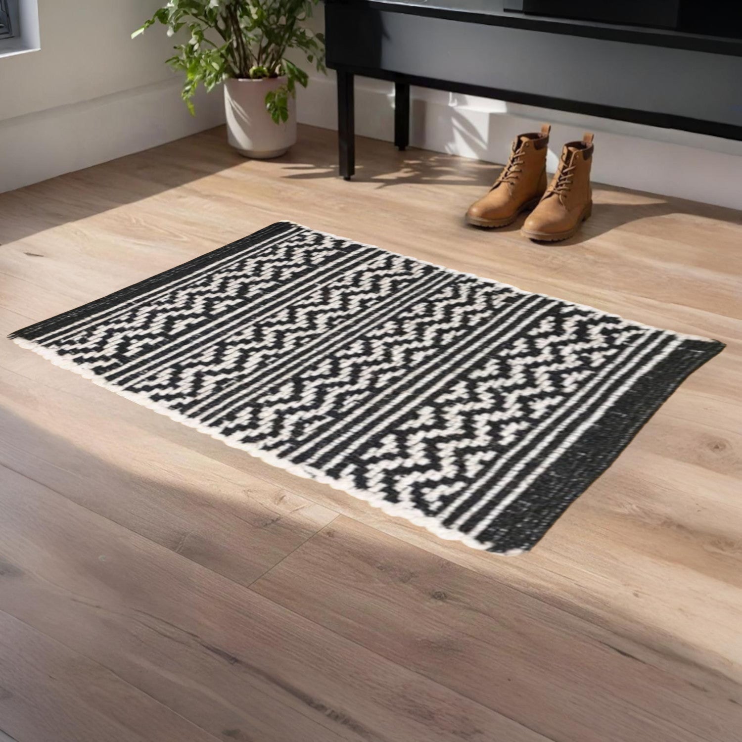 Home Universal® Alfombra Jarapa de Algodón Lavable | Diseño Geométrico Artesanal | Decoración Boho Mediterránea para Salón, Dormitorio, Pasillo y Cocina | Suave, Ligera y Resistente | Negro (Rayas y Zigzag)