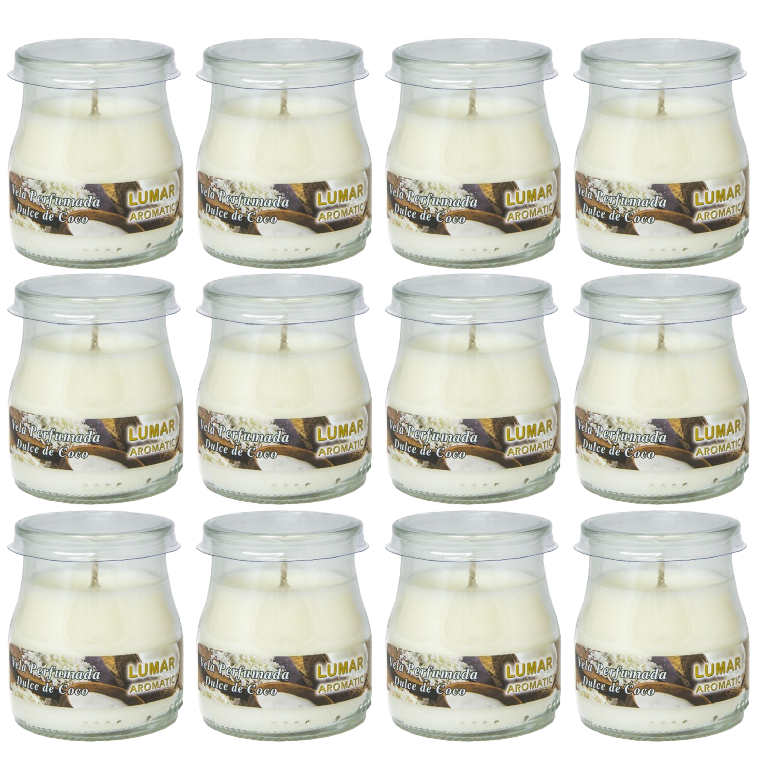 Home Universal® Pack de 3/6/12 Velas Aromáticas en Vaso de Cristal Reciclable LUMAR AROMATIC – 24h de Duración por Vela – Cera Vegetal Perfumada – 16 Fragancias Disponibles – Fabricadas en España – 7x6cm (Dulce de Coco)