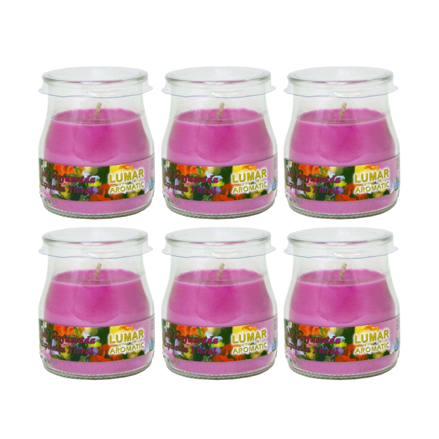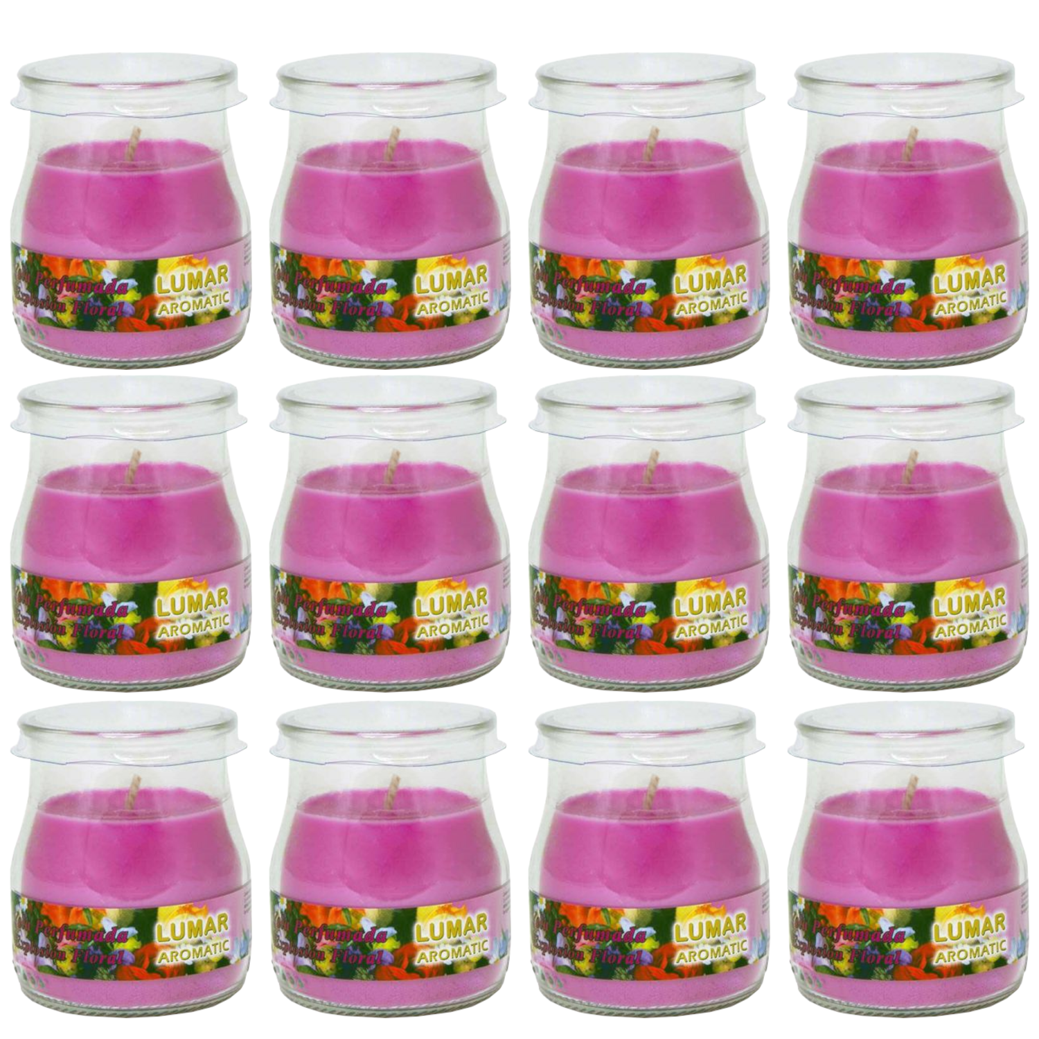 Home Universal® Pack de 3/6/12 Velas Aromáticas en Vaso de Cristal Reciclable LUMAR AROMATIC – 24h de Duración por Vela – Cera Vegetal Perfumada – 16 Fragancias Disponibles – Fabricadas en España – 7x6cm (Explosión Floral)