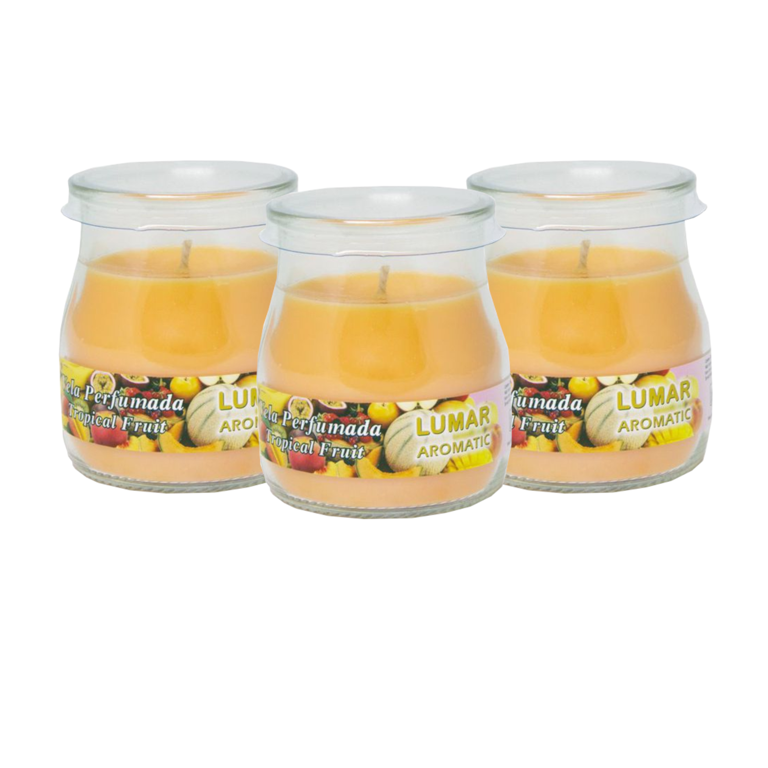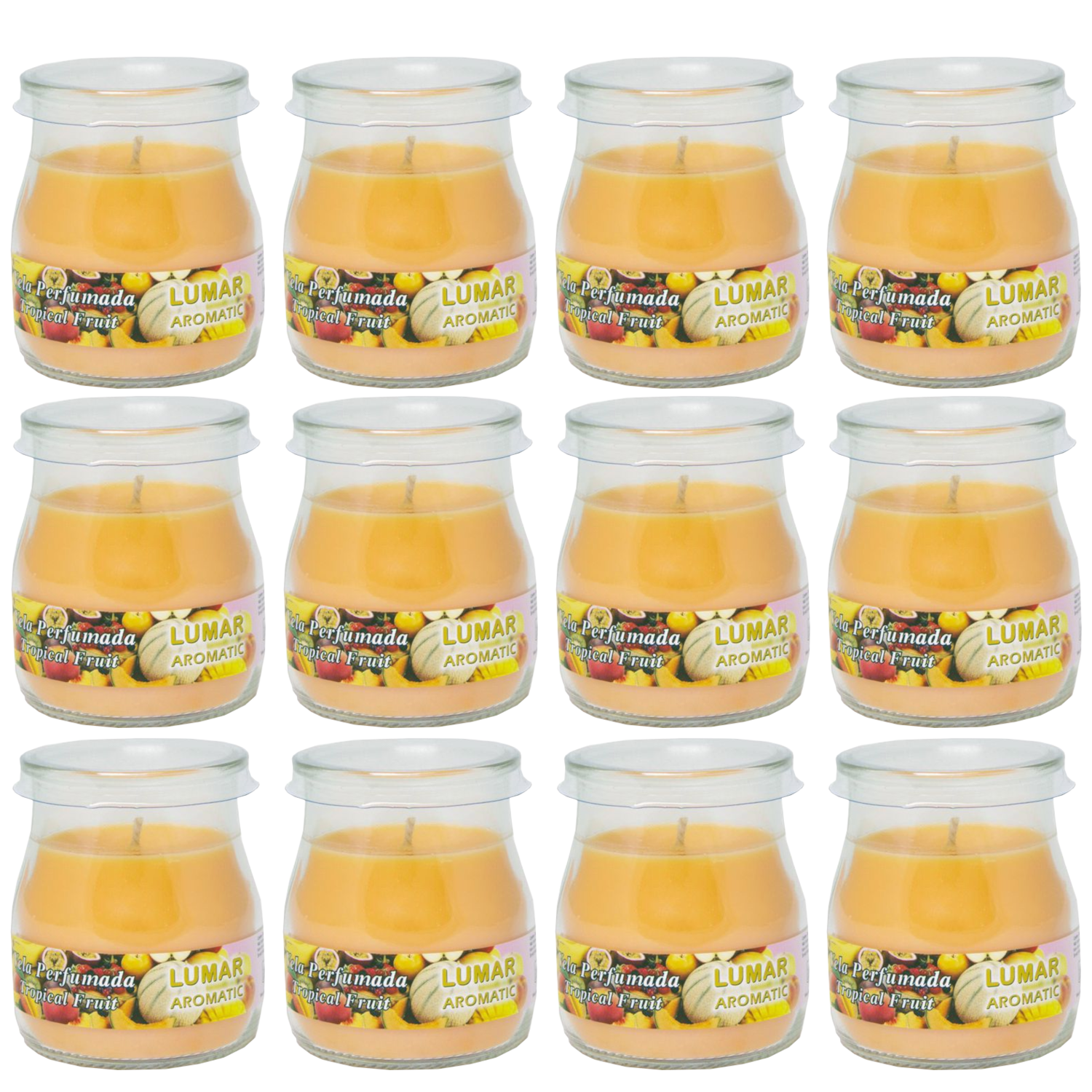 Home Universal® Pack de 3/6/12 Velas Aromáticas en Vaso de Cristal Reciclable LUMAR AROMATIC – 24h de Duración por Vela – Cera Vegetal Perfumada – 16 Fragancias Disponibles – Fabricadas en España – 7x6cm (Frutas Tropicales)