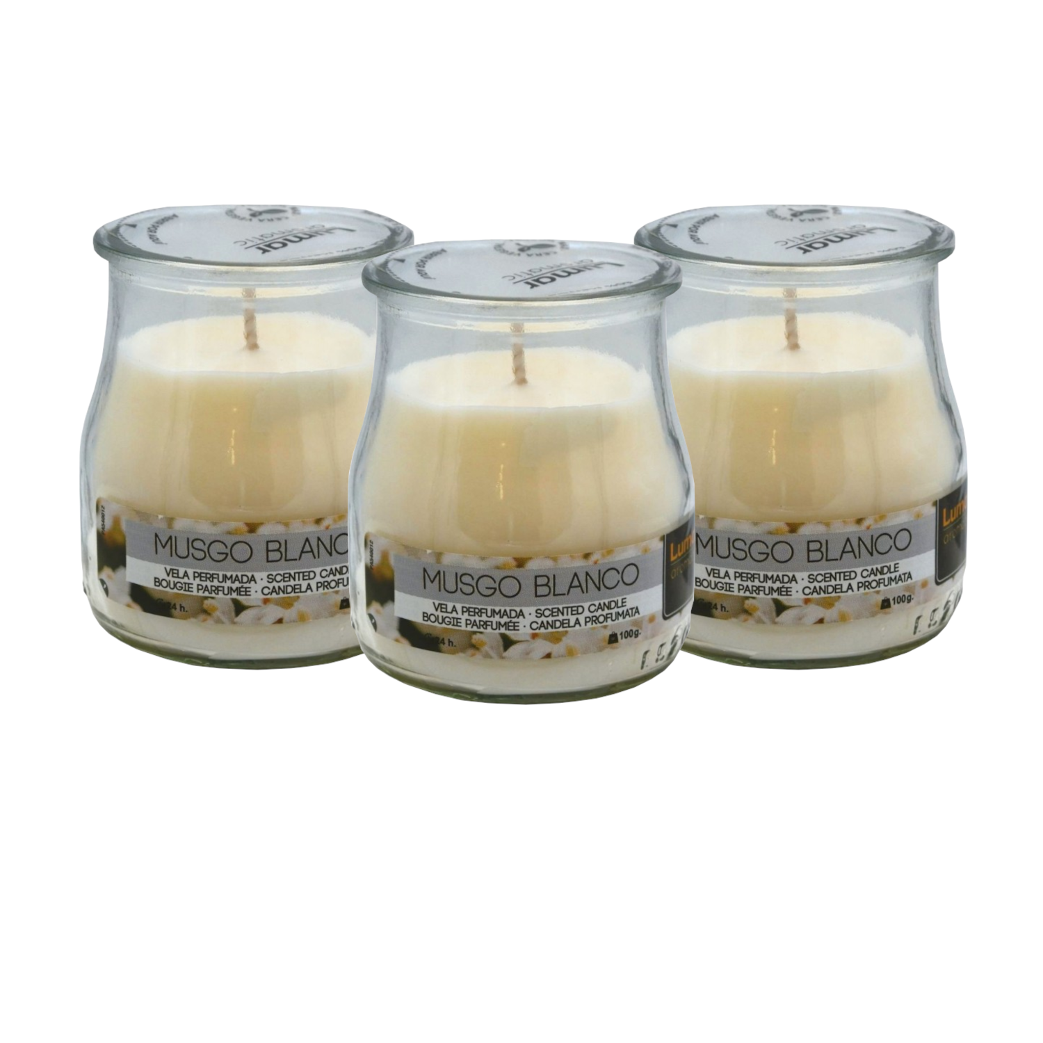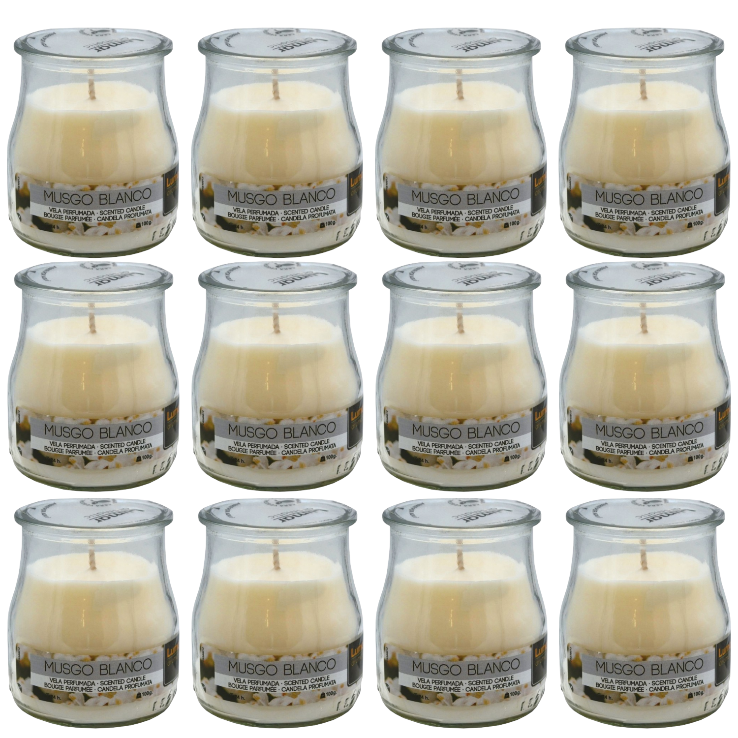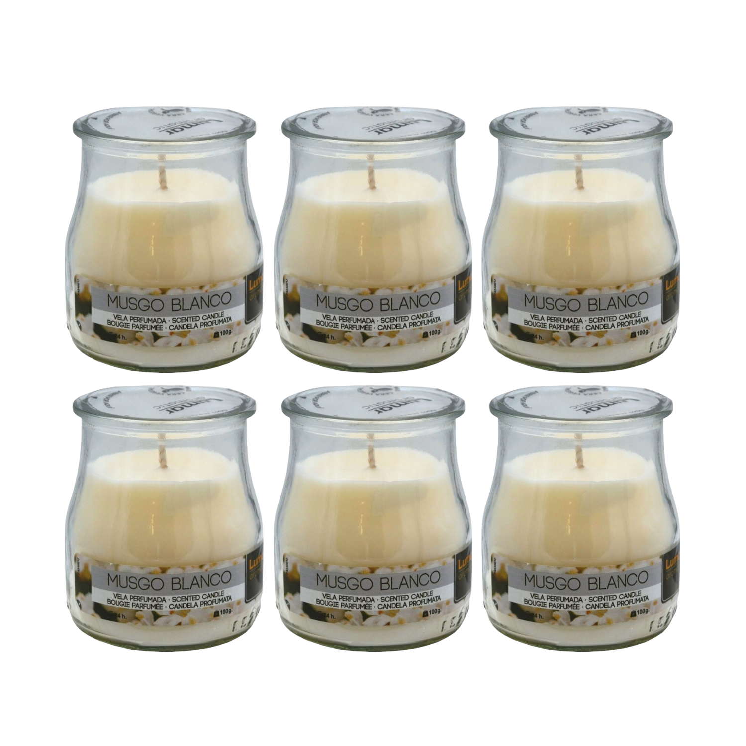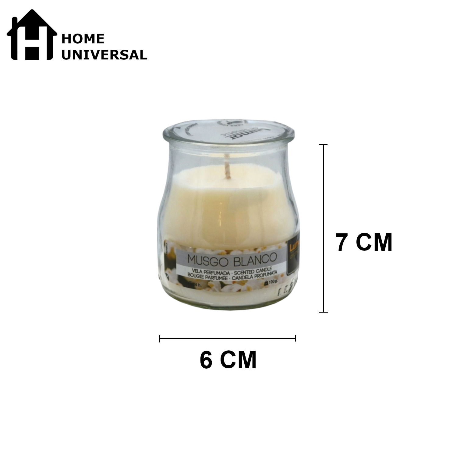 Home Universal® Pack de 3/6/12 Velas Aromáticas en Vaso de Cristal Reciclable LUMAR AROMATIC – 24h de Duración por Vela – Cera Vegetal Perfumada – 16 Fragancias Disponibles – Fabricadas en España – 7x6cm (Musco Blanco)