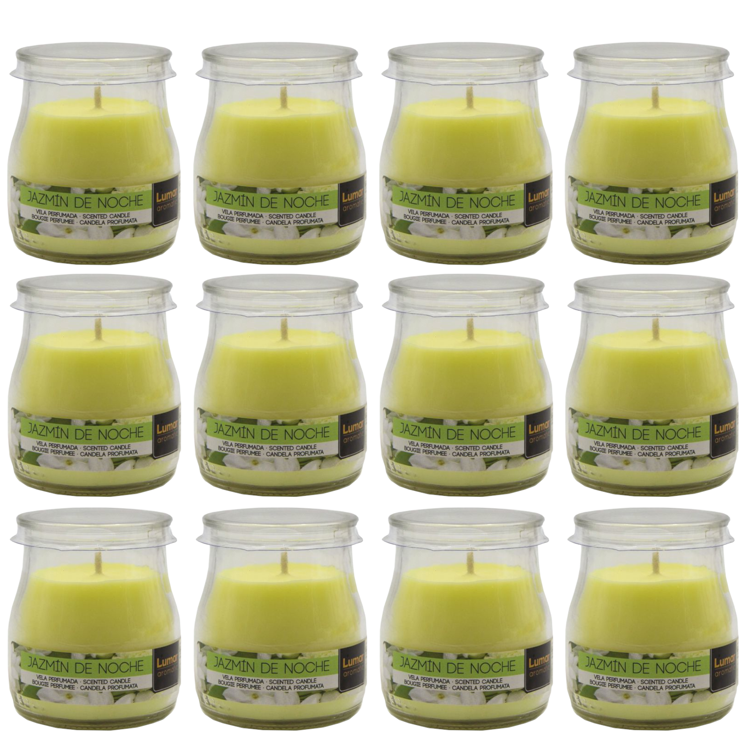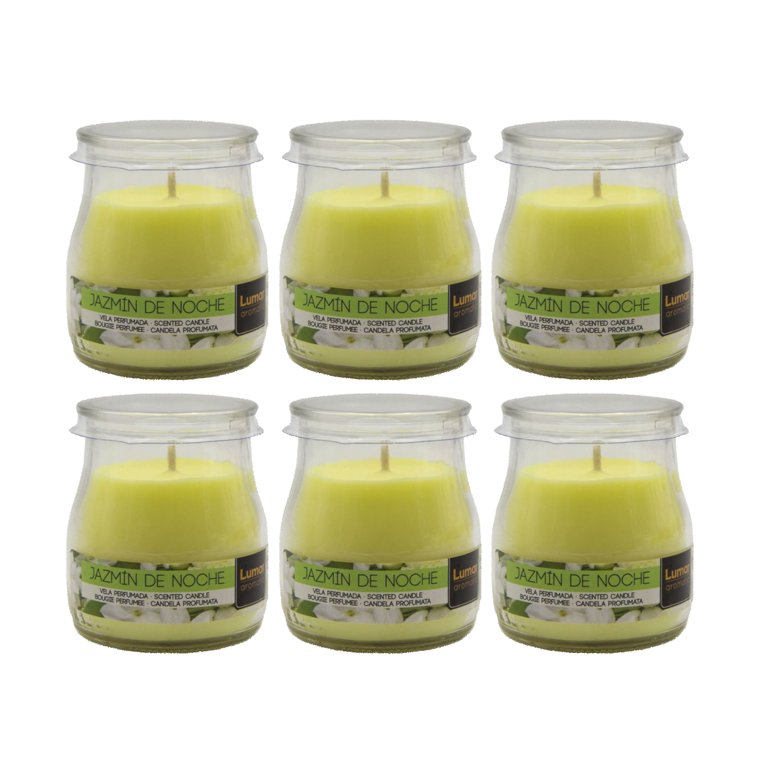 Home Universal® Pack de 3/6/12 Velas Aromáticas en Vaso de Cristal Reciclable LUMAR AROMATIC – 24h de Duración por Vela – Cera Vegetal Perfumada – 16 Fragancias Disponibles – Fabricadas en España – 7x6cm (Jazmín de Noche)