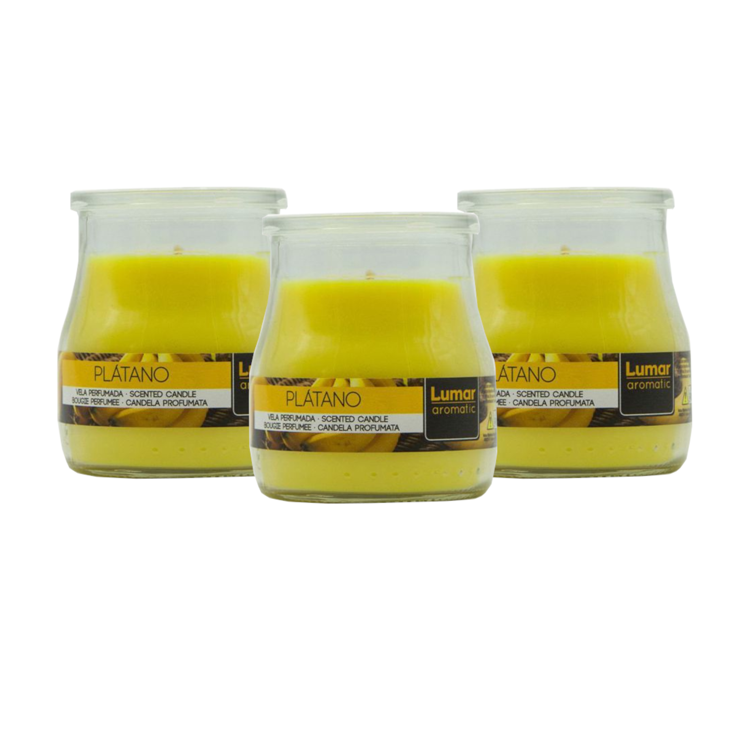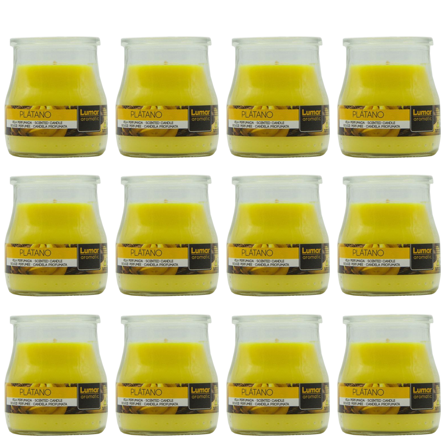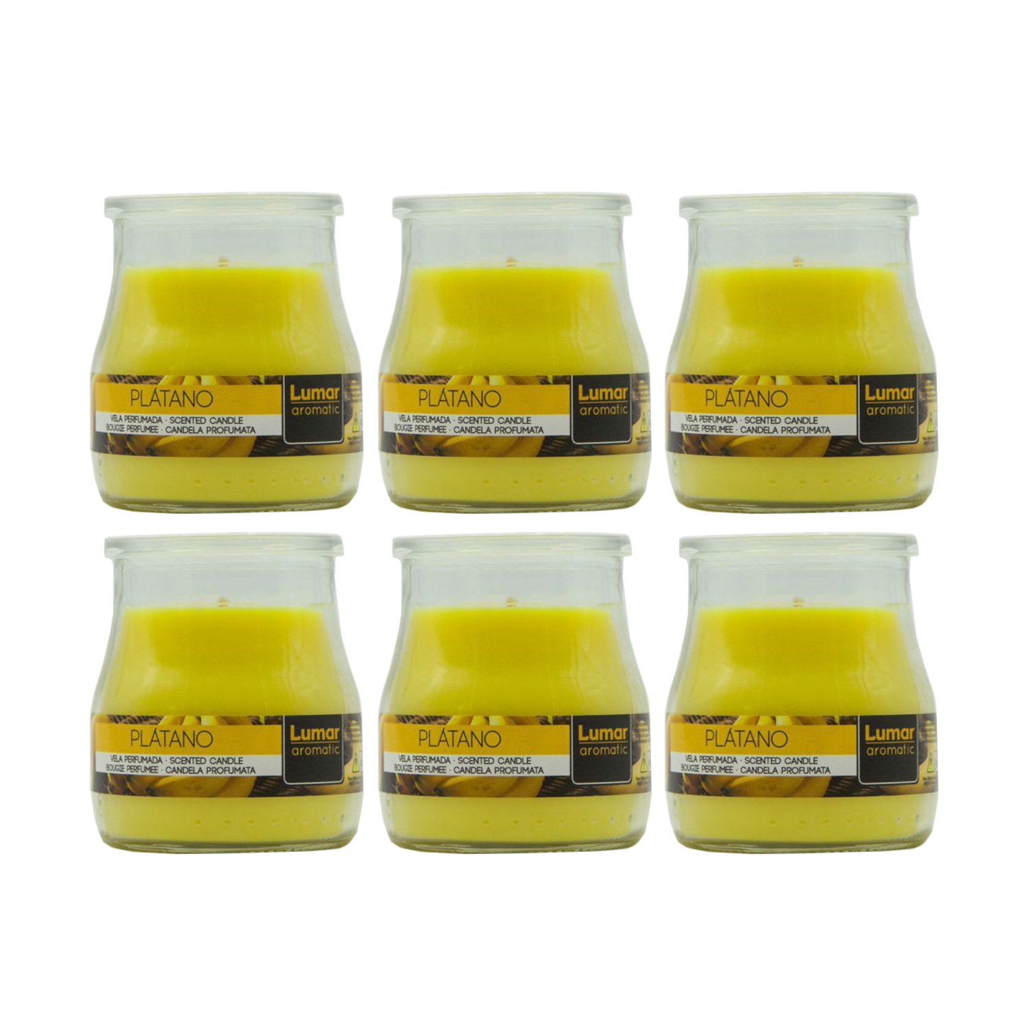 Home Universal® Pack de 3/6/12 Velas Aromáticas en Vaso de Cristal Reciclable LUMAR AROMATIC – 24h de Duración por Vela – Cera Vegetal Perfumada – 16 Fragancias Disponibles – Fabricadas en España – 7x6cm (Plátano)