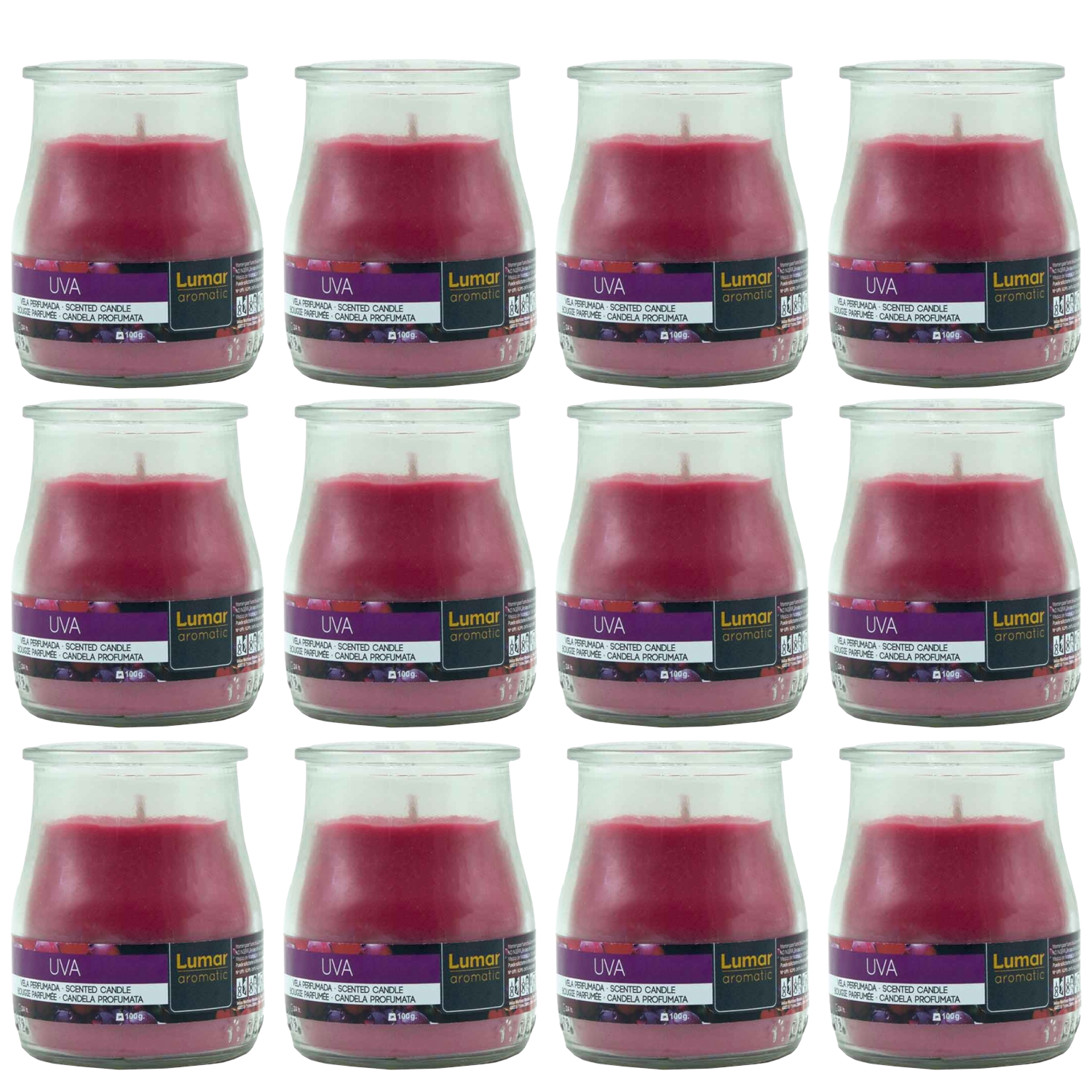 Home Universal® Pack de 3/6/12 Velas Aromáticas en Vaso de Cristal Reciclable LUMAR AROMATIC – 24h de Duración por Vela – Cera Vegetal Perfumada – 16 Fragancias Disponibles – Fabricadas en España – 7x6cm (Uva)