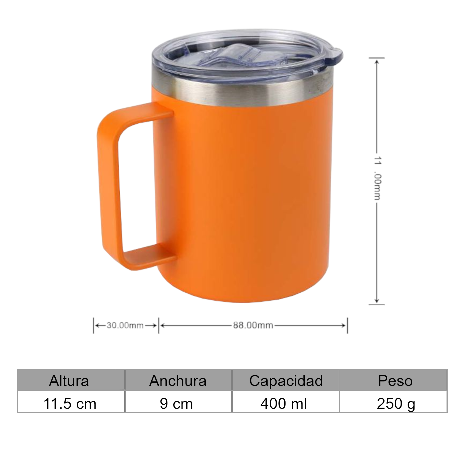 Taza térmica de 400 ml fabricada en acero inoxidable de alta calidad, ideal para café, té y todo tipo de bebidas, diseñada para mantener el calor y el frío durante más tiempo; cuenta con tapa práctica para evitar derrames, es reutilizable y resistente, perfecta para usar en casa, la oficina o llevar de viaje, ofreciendo comodidad, durabilidad y un diseño funcional para el uso diario.